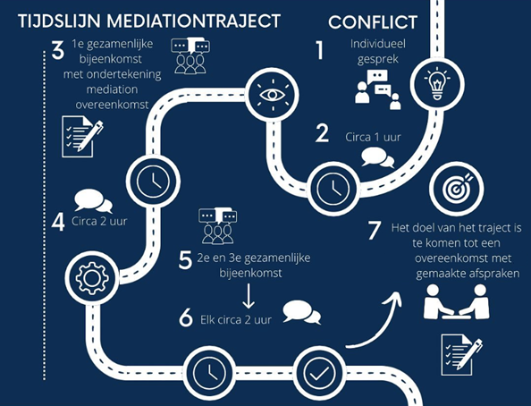 Mediation vraagt om structuur, veiligheid en duidelijkheid. Conflicten zijn vaak beladen; daarom is het belangrijk dat het proces zorgvuldig wordt opgebouwd. Hieronder leest u hoe een mediationtraject doorgaans verloopt.